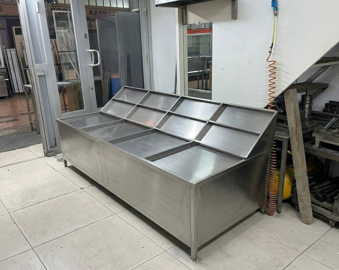 Hijyen ve Tazelikte Kusursuz Çözüm Balıkçılık sektöründe başarının sırrı, ürünün tazeliğini korumak ve bu tazeliği müşteriye en çekici haliyle sunabilmektir. İşletmeniz için özel olarak tasarladığımız krom balık tezgahları, estetiği endüstriyel dayanıklılıkla buluşturarak satış alanınızın merkezine yerleşiyor. Neden Krom Balık Tezgahlarımızı Tercih Etmelisiniz? 1. Üstün Malzeme Kalitesi (304 Kalite Paslanmaz Çelik) Tezgahlarımız, balıkçılık sektörünün zorlu koşulları düşünülerek 304 kalite paslanmaz çelikten üretilmiştir. Deniz tuzu, nem ve sürekli su temasına karşı mükemmel direnç gösterir; paslanmaz, kararmaz ve uzun yıllar boyunca ilk günkü parlaklığını korur. 2. Maksimum Tazelik İçin Ergonomik Eğim Tezgahın özel eğimli tasarımı, balıkların buz üzerinde en iyi şekilde sergilenmesini sağlar. Bu yapı, balığın kendi suyu ve eriyen buzun yarattığı nemin, ürünle temas etmeden hızlıca tahliye kanallarına ulaşmasına olanak tanır. Böylece balıklarınızın raf ömrü uzar ve görüntüleri her zaman canlı kalır. 3. Hijyenik ve Bakteri Üretmeyen Yüzey Gıda güvenliği, sektörümüzün en kritik unsurudur. Krom tezgahlarımızın pürüzsüz yüzey yapısı, bakteri ve mikroorganizmaların barınmasına izin vermez. Günlük temizlik süreçlerinde deterjan ve suyla kolayca arındırılabilir, böylece işletmeniz her zaman en yüksek hijyen standartlarını korur. 4. İşletmenize Özel Modüler Tasarım Her balık tezgahının ihtiyacı farklıdır. İster küçük bir butik balıkçı olun, ister büyük bir balık market; alanınıza tam uyum sağlayan özel ölçülerde üretim yapıyoruz. İhtiyacınıza göre tekerlekli (mobil), ayaklı veya özel aydınlatma sistemli seçeneklerle tezgahınızı kişiselleştirebiliriz. Teknik Özellikler Gövde Malzemesi: Korozyona dayanıklı 304 Kalite Paslanmaz Çelik. Tahliye Sistemi: Buzun erimesini kolaylaştıran entegre, tıkanmaz tahliye kanalları. Temizlik: Kolay temizlenebilir pürüzsüz yüzey, bakteri tutmaz doku. Opsiyonel Özellikler: Müşteri talebine göre entegre atık toplama hazneleri ve ayarlanabilir yükseklik. Kullanım Alanları: Balık restoranları, balık marketler, oteller ve profesyonel mutfaklar. Görünür Tazelik, Artan Satışlar Müşterileriniz için görsel bir şölen oluştururken, kromun sunduğu modern ve profesyonel duruşla güven kazanın. Tezgahlarımız sadece bir teşhir ünitesi değil; ürün kalitenizi en üst noktaya taşıyan ve işletmenizin profesyonelliğini yansıtan bir yatırımdır.